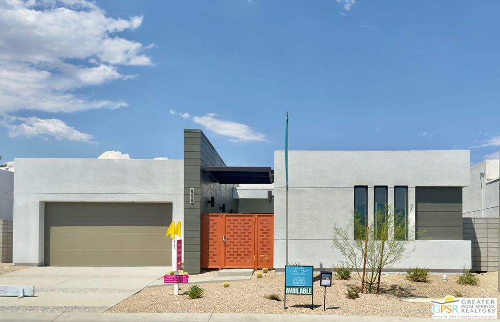 LAST FLOOR PLAN AVAILABLE: New Construction - Move in July 15,2025. Residence 1 - The Calabria offers a spacious 3 bed/3 bath home with detached casita, swimming pool, solar and landscaping package all on one level. Enter from the street into your private courtyard with swimming pool and detached casita. The open great room/dining and kitchen concept offers 12 foot high ceilings, with gourmet kitchen and walk in pantry. Primary bedroom is tucked away and is private with large walk in closet and beautiful bathroom suite. Bedroom number 2 has direct access to the pool/patio area and would be great as an office or media room. Miralon is one of Palm Springs Premiere Communities offering Modern Architecture, a 10 million dollar club house with Yoga Studio, Fitness Center, Wi-Fi Cafe, Bar, meeting rooms, prep kitchen, dog park, 7 miles of walking trails and 7000 Olive trees. This home includes many upgrades. Solar is leased but the builder pre-pays the lease for 25 years. NOTE: Pics shown in the listing are of Gallery's Model 1 and not of the actual home on lot 331. Home will be completed Mid July.
