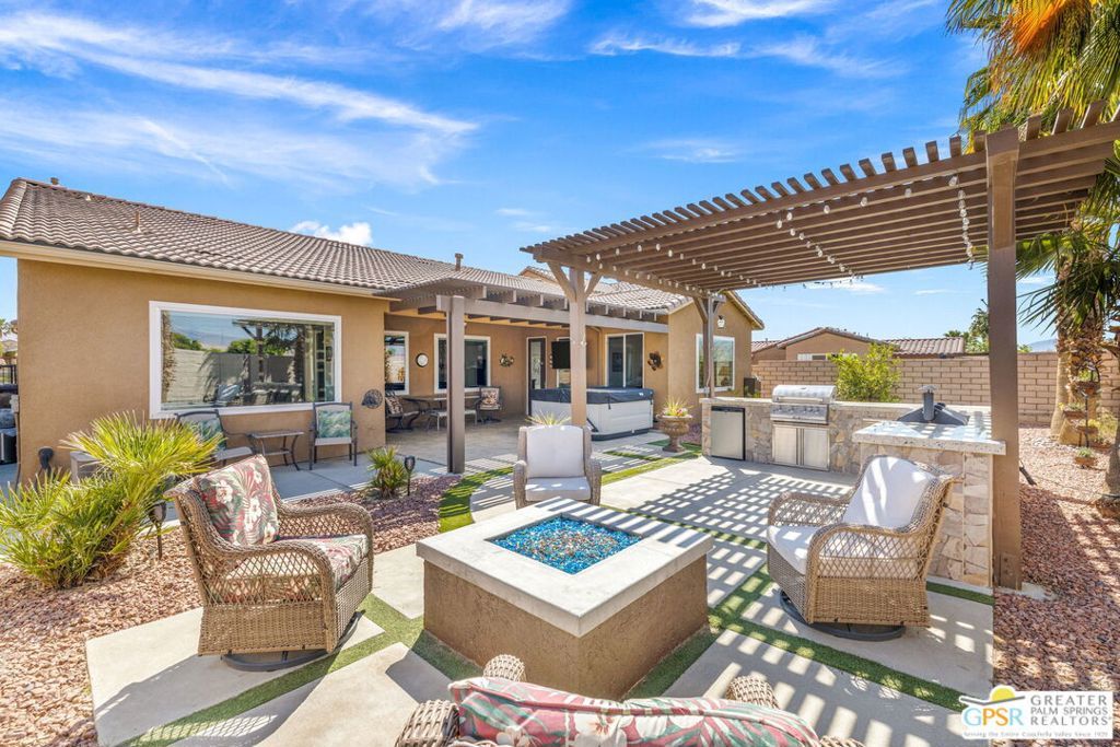 The ONE TO SEE! Check out this rare-to-market Palermo floor plan at gated Terra Lago! An impressive list of upgrades takes things to the next level both inside and out. Be it full-time, seasonal, or investment, this 3-bedroom + 2-bath home delivers the desert good life with its fantastic outdoor living.The SHORT TERM RENTAL friendly HOA is another perk! Proximity to the clubhouse and resort-style pools makes all the difference as well. The main living areas enjoy effortless flow, lots of natural light, and a great mix of dining/conversation areas. You'll find the handsome fireplace plays perfectly in the living room. Bedrooms enjoy a nice separation with the Ensuite Primary opening to the covered patio. The ensuite bath features a separate tub and shower, dual vanities, plus walk-in closet. Guest Bedroom #2 is just adjacent to a full bath. Guest Bedroom #3 is currently enjoyed as a den. Heading outside, a series of pergolas help set this private backyard apart with its Jacuzzi tub, newer tile underfoot, mountain views, and destination-style fire pit. Notable landscape and hardscape improvement as well! Onto the beautifully tiled garage featuring convenient built-in storage plus tandem configuration on one end for either a golf cart or more storage. The nearby Golf Club at Terra Lago consists of 36 challenging holes with dramatic elevation changes and stunning views. Outstanding hiking nearby at Badlands Trail plus famed music festivals Stagecoach and Coachella are a short hop away. Enjoy it all.
