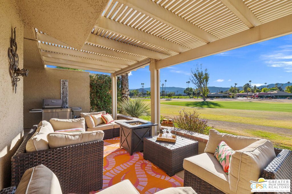 Introducing this exquisite Vintage Model showcasing panoramic views of both the mountains and the expansive 10th fairway. Southwest facing location with the Cafe, Clubhouse and 2 salt water pools/spas just a short walking distance away.. As you enter, you'll be welcomed with warm color tones with natural light that fills the space. Enjoy cooking and entertaining in the open kitchen with stainless steel appliances, granite countertops, and an ample-sized peninsula for added counter space and eating. The breakfast bar seating has plenty of cabinet space for your storage needs. The vaulted ceilings in the open concept living room make this home feel spacious and welcoming. Intelligent floor plan with owner's suite and bath is on one side of the home, and guest bedroom and bath on the opposite side, which is perfect for privacy and separation, and makes this one of the most popular models. Both bathrooms have quality finishes and have a complementary design with the rest of the stunning home.Step outside the sliding glass door, and you will see an extended tiled patio with a patio cover and an exterior pony wall for furry friends with sunset views that cannot be missed. A 2-car garage is attached, which is a valuable feature. Exceptional FURNISHINGS included per inventory list! The Palm Desert Resort Country Club has a beautiful clubhouse, Coachella Valley's premier pickleball and tennis club, and an award-winning golf course. The resort is a very active community with a clubhouse (includes formal dining, a lounge, and a pro shop), and 20 pools and spas. The Resorter has a guard gate with 24-hour security. There is proximity to dining and shopping. Desert activities include hiking and biking trails near the resort. The resort is 4 miles from the Indian Wells Tennis Gardens, 10 miles from Empire Polo Grounds, 25 minutes to the Palm Springs Airport, and 2.5 hours to San Diego, Los Angeles, and Disneyland. The resort is a gem and is short-term friendly and the owners have 5-star reviews on two hosting sites. You will be in paradise out on the patio, enjoying the sunset views and resort ambiance! This is a must-see!