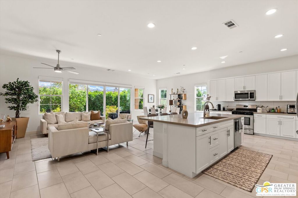 A premier quiet end/corner location inside the highly desirable Villa Portofino 55 plus gated community. Top notch improvements immaculately maintained this large 2,341 sq ft residence has 3 bedrooms plus a den and 3 baths. Gracious flowing open floor plan with pleasing natural light and lush gardens. It enjoys fantastic western mountains and sunset views because of its premium location next to an open community area. You can enjoy views and privacy that are unique within this vibrant community. The spacious home has 10ft ceilings throughout, and a spectacular great room that combines the living room, dining area, and eat-in kitchen into one. The spacious kitchen features shaker-style cabinets with stainless steel appliances, French door refrigerator, gas cooktop and a large prep island with oversized sink, and quartz countertops with breakfast counter and walk in pantry. The great room also opens to a covered south patio via double sliding doors. Located off the main entry is the spacious den or possible fourth flex bedroom, with sliding doors, private patio, and unobstructed western views. The Primary bedroom has south exposure and access to the covered patio. A light filled space, this beautiful room also has a spa-like ensuite bath with dual vanities, luxurious soak tub and walk-in closet. The 2 additional bedrooms are accessed from the entry hall and enjoy a spacious hall bath with shower. Other amenities include custom window treatments with both filtered and blackout shades, full laundry room, double car-attached garage, and cost-saving and eco-friendly solar system too! HOA dues include clubhouse membership, which gives you access to the heated community pool/spa, recreation/fitness facilities, and Bistro restaurant.