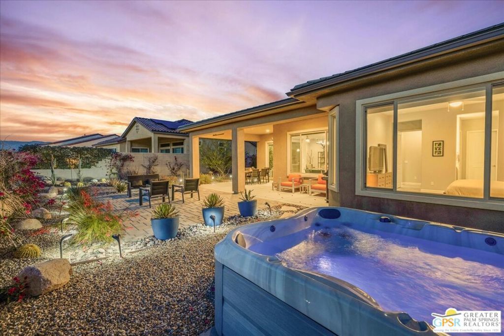 Breathtaking views and modern elegance await in this beautifully upgraded PHASE 2 PLAN 6 Preserve home in the highly sought-after 55+ community of Del Webb Rancho Mirage. Showcasing the charming Prairie facade, this thoughtfully designed floorplan includes 2 bedrooms, 2 bathrooms, and a versatile den/media space perfect for work or relaxation. From the moment you arrive, custom details set this home apart - from the modern glass-inset front door to the unique tile flooring and custom window treatments throughout. The heart of the home is the stunning kitchen, featuring a sleek Whirlpool appliance package, 42" upper cabinets with stylish hardware, a bold hexagonal tile backsplash, and a spacious island adorned with designer pendant lighting - ideal for casual dining or entertaining. The expanded primary suite is a private sanctuary offering plush upgraded carpet, abundant natural light, and serene mountain views. The en suite bath boasts dual sinks, premium fixtures, a high-end bidet seat, a beautifully tiled walk-in shower, and a generous walk-in closet with custom storage. Step outside to your own private retreat - a fully landscaped backyard with a covered patio, built-in heat lamps, gas firepit, and above-ground spa, all set against a backdrop of gorgeous mountain views. It's the perfect space to relax or entertain year-round. Additional features include a solar system (PPA), laundry room, rain gutter, owned security sytem, and a built-in shoe and coat organizer for added convenience. Enjoy all the benefits of Del Webb's vibrant resort-style living with access to a clubhouse, sparkling pool and spa, fitness center, tennis and pickleball courts, putting green, and a full calendar of community activities. Experience comfort, style, and community at its finest - welcome home to Del Webb Rancho Mirage. *Golf cart & Furnishings available per inventory under separate agreement.