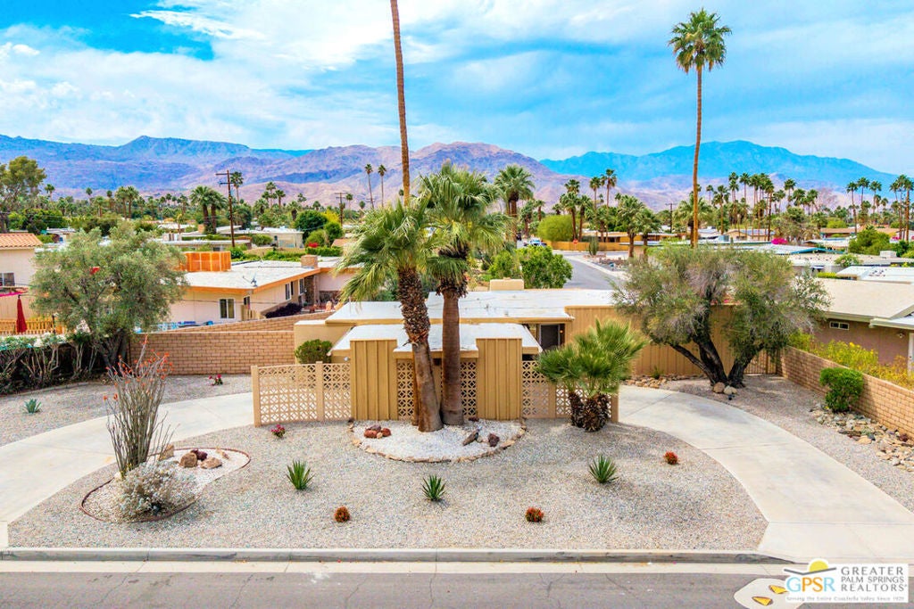 Charming Mid Century home in South Palm Desert. This 2 bed, 2 bath home has just been freshly painted throughout and re-landscaped. There is an amazing breeze block wall in front of the carport; part of the oversized curved driveway. The property has great curb appeal. The living space has a nice sized great room with gas fireplace, dining area, kitchen and walls of glass to the rear patio space. The bedrooms have ample closet space, the primary is ensuite. There are actually two patios, one off the great room and the second off one of the bedrooms; all looking to the west for great sunsets and mountains views. Both patios are semi-covered for partial shade. The large backyard is enclosed for privacy with block walls, and also has an additional open patio space for dining under the stars. This home is in a great location; near amenities, close to El Paseo for great dining and shopping options and close to the the highly regarded Washington Charter School. This will not last long!