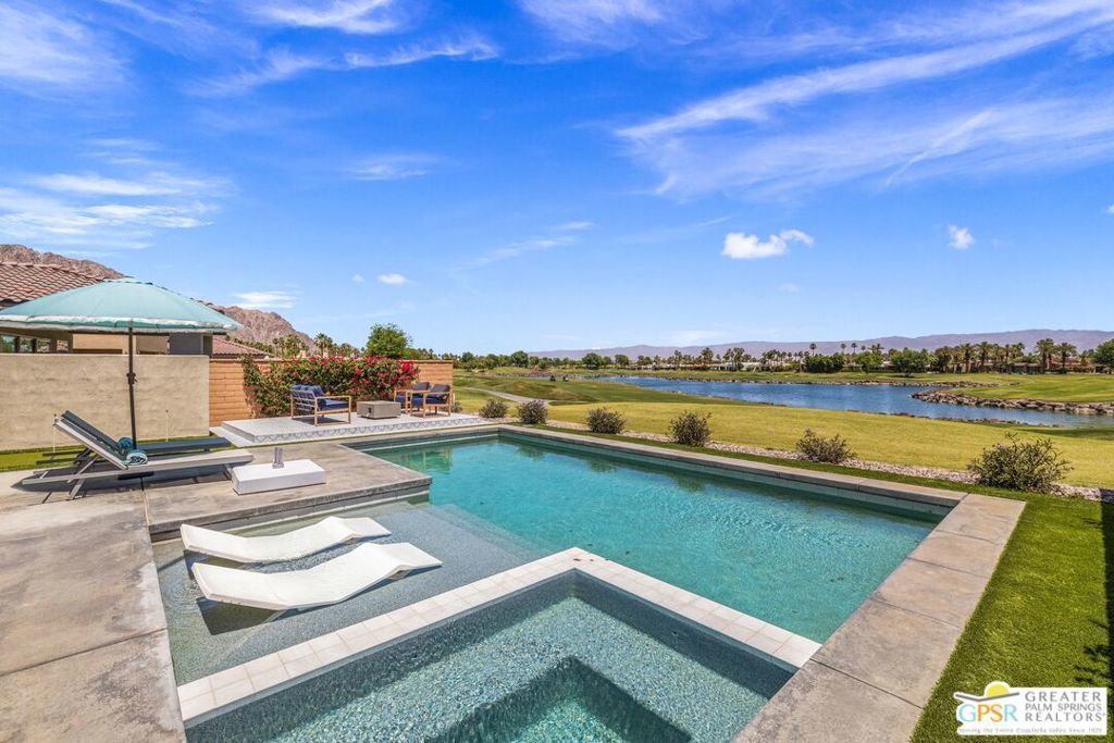 WOW! Set against the stunning backdrop of the 18th hole on PGA West's prestigious Stadium Course, this 2022-built TURNKEY furnished home on Champions Way offers mountain VIEWS, owned SOLAR, and the freedom to SHORT-TERM RENT. Open-concept living and dining areas flow seamlessly into the chef-inspired island kitchen, featuring premium finishes, soaring ceilings, and furnishings straight from the pages of Dwell magazine. Expansive glass walls open to the outdoor spaces, where you'll find a covered patio with built-in barbecue, a saltwater pool and spa with a Baja-style sunning bench, outdoor shower, fire pit, and putting green, perfect for both relaxation and entertaining. The first-floor primary suite opens directly to the patio and includes dual vanities, a large walk-in shower, and a spacious walk-in closet. With great separation of bedrooms, an additional guest bedroom on the first floor ensures comfortable living for all. Upstairs, the loft with panoramic mountain views is ideal for relaxing, while a nearby guest suite with a private bath delivers beautifully. With a 2-car garage, golf cart storage, and proximity to the vibrant lifestyle of festivals, polo, tennis, and golf tournaments, this home places you at the heart of it all. PGA West's exceptional offerings, including 5 resort courses, 4 private courses, 5 clubhouses, and world-class amenities, create an unmatched living experience. Take the Matterport Virtual Tour for a better sense of flow and ENJOY IT ALL!