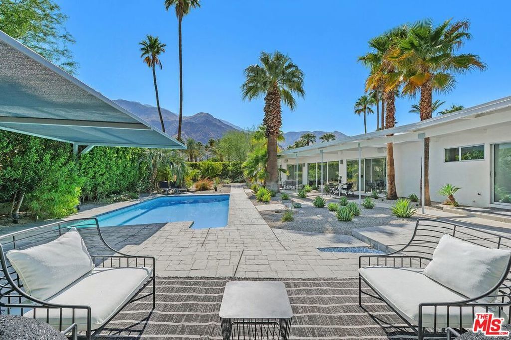 This dramatic Mid-Century home, located in the coveted Old Las Palmas neighborhood, offers complete privacy as well as dramatic views of the San Jacinto mountains. Built in 1955, it was re-imagined by renowned architect Lance O'Donnell, providing both drama and modern flair to the original design. Fully gated and walled, this home is truly an entertainer's delight!! Enter through a secure gate to the front yard with beautiful desert landscaping and a water feature. The front entrance, framed by walls of glass, is highlighted by a dynamic pivoting 6-foot-wide glass entry door. With an open floor plan, the living room, kitchen, and dining room flow seamlessly, providing easy access to the private yard with a beautiful pool, covered lounging areas and mountain views. The gourmet chef's kitchen features stainless steel appliances, glass tiles, quartzite counters, a large pantry and breakfast bar. There are 2 ensuite guest bedrooms as well as 2 primary suites that access a private spa and 2 outdoor showers. Polished concrete floors run throughout the house. A gated driveway leads to the 2-car air-conditioned garage with epoxy floors, EV charger and direct access. With 38 solar panels, 3-zone HVAC, dual-pane windows and LED lighting, this energy-efficient home is ideal for the desert environment.