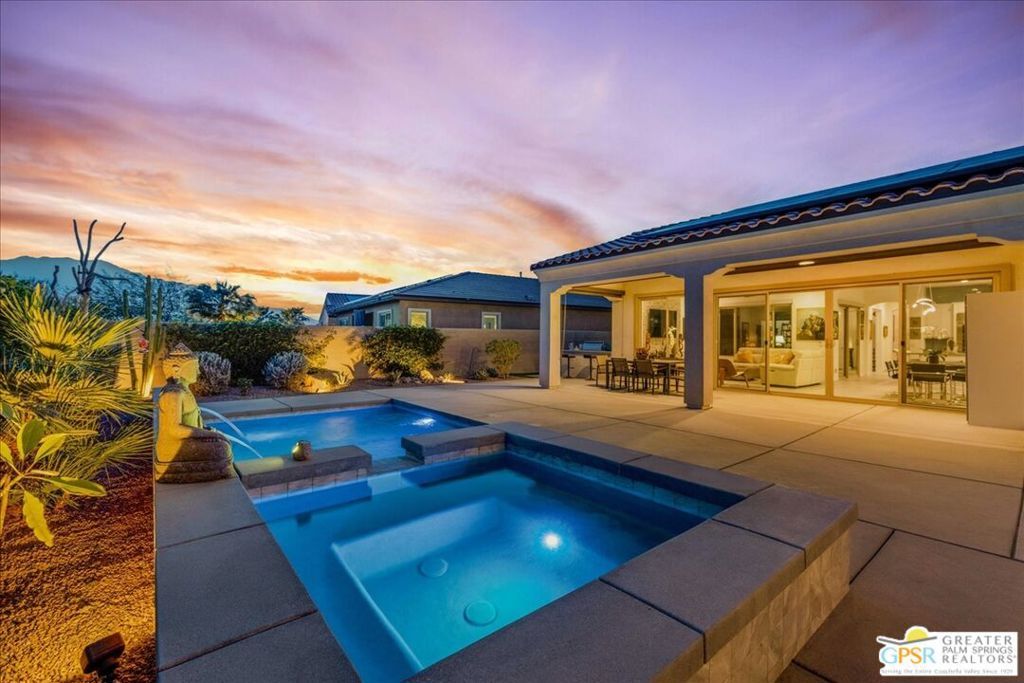 Experience the pinnacle of luxury and modern convenience in this stunning home, nestled within the prestigious 55+ community of Del Webb Rancho Mirage. Situated in Phase 2, this exquisite Spanish-inspired HAVEN floorplan showcases unobstructed south and west mountain views, offering a breathtaking backdrop for daily living and entertaining. Step through the custom iron and glass entry door into an ambiance of sophistication, where an elegant accent tile wall sets the tone. The seamless flow of 12"x24" porcelain tile flooring, an arch package, and modern six-paneled doors create a refined aesthetic. A unique center courtyard, perfectly positioned adjacent to the kitchen, invites moments of tranquility and seamless indoor-outdoor living. Designed for culinary excellence, the chef's kitchen features an expansive EXECUTIVE ISLAND, sleek 42" upper cabinetry, a stylish FARM SINK, quartz countertops, and a custom glass tile backsplash extending to the ceiling. Premium appliances, including a Sub-Zero glass-door refrigerator and a MIELE dishwasher, and spacious walk-in pantry provides ample storage. The open-concept design is highlighted by a DOUBLE CENTER-OPENING SLIDING DOOR, seamlessly blending indoor and outdoor spaces. Step onto the full-length covered patio and immerse yourself in resort-style living. The backyard oasis features a sparkling pool and spa, a stylish pergola, a cozy fire pit, a fully equipped grilling station, roller shades for added comfort, and a serene water featurecreating the perfect setting for unforgettable gatherings. The Owner's Suite is a retreat of its own, boasting sound-insulating windows, motorized drapes, and mesmerizing mountain views. The spa-like ensuite offers dual vanities, a spacious walk-in shower with a built-in bench, and an oversized custom closet. Smart home features, including voice and app-controlled lighting, sound, and more, allow you to set the perfect ambiance with ease. The oversized 2.5-car garage comes complete with an ENERGY UPGRADE, custom storage solutions, and non-slip floor tiling. Plus, with a Tesla Solar Lease at just $112/month, energy savings are built right in. Beyond the home, the Del Webb Rancho Mirage community offers a world-class lifestyle with a state-of-the-art clubhouse, fitness center, resort-style pool and spa, tennis courts, pickleball, and so much more. This is more than a homeit's a luxurious retreat designed for effortless living. Don't miss the opportunity to make it yours!