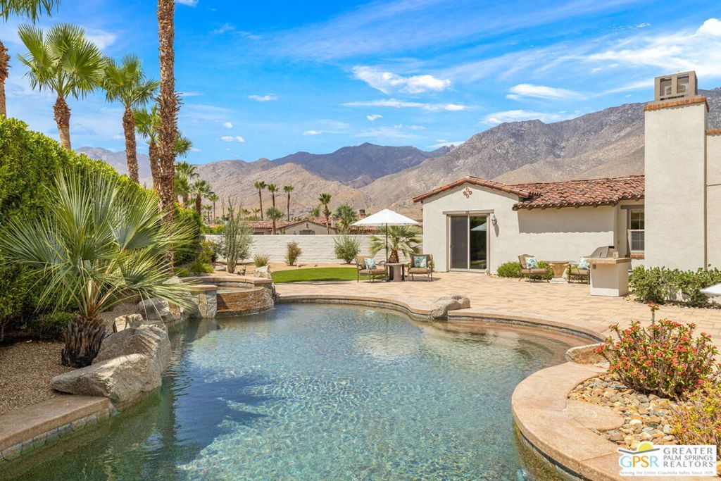 Welcome to Monte Sereno, a boutique enclave of estate-style homes in South Palm Springs, where you own the land (fee simple) and enjoy some of the most breathtaking views the desert has to offer. Nestled in a prime location, this 4 bedroom, 3.5 bath residence offers privacy and comfort - all in one beautifully designed package. From the moment you enter, you'll feel the pride of ownership throughout. Owned solar panels provide long-term energy efficiency, while tall ceilings, clerestory windows, and multiple sliding glass doors flood the home with natural light and showcase panoramic mountain views in every direction. The gourmet kitchen is bright and open, featuring a walk-in pantry and seamless flow into the expansive great room perfect for entertaining or simply enjoying the peaceful desert ambiance. There are casual and formal dining areas, and access to the climate-controlled, attached 2-car garage. Step outside to your ultra-private, south-facing backyard a true resort-style retreat. Surrounded by custom pavers and lush, designer landscaping, the pool and spa take center stage against a dramatic mountain backdrop. Outdoor fireplace, built-in BBQ and misting system, too! Inside, the floor plan offers ideal bedroom separation. The Primary Ensuite includes a spacious walk-in closet, dual vanities, soaking tub, walk-in shower, and even a private outdoor patio. On opposite corners of the home, you'll find three more versatile bedrooms. Junior Ensuite Two offers beautiful views and a private bath. Junior Ensuite Three features mountain views and connects to a full bath. Bedroom Four (currently enjoyed as a family/media room) this space offers incredible views, a wardrobe closet, backyard access, and a connected bath making it ideal as a fourth bedroom, office, or bonus retreat. Every inch of this home is designed to celebrate the best of Palm Springs living!