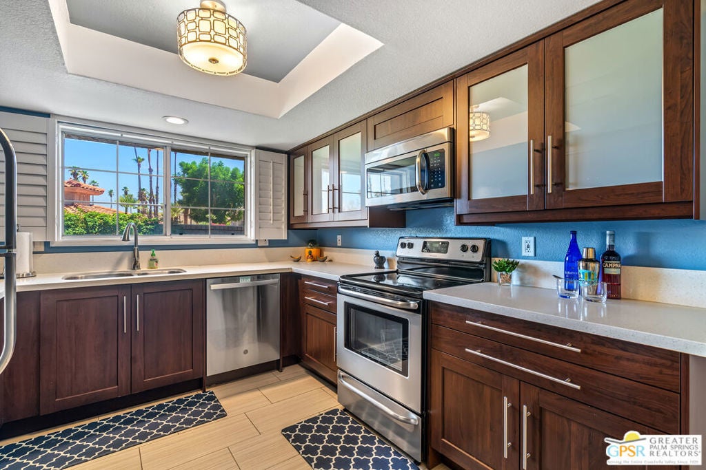 Welcome to your perfect Palm Springs getaway or full-time retreat in the sought-after Mesquite Country Club, a gated community nestled on fee land - you own it! This beautifully updated one-bedroom, one-bath condo is single-level with no one above or below, offering privacy and comfort. The kitchen and bathroom have been tastefully remodeled, and the home features woodgrain tile flooring throughout for a sleek, modern look. Sold fully furnished and turnkey, just bring your toothbrush and settle in! Whether you're looking for a primary residence, vacation home, or a smart investment property, this condo checks all the boxes. HOA includes water, trash, cable, internet, roof, and exterior. Mesquite Country Club allows short-term rentals with a 7-day minimum, making it ideal for flexible living or rental income potential. Enjoy the lush grounds, pools, spas, tennis courts, and easy access to shopping, and downtown Palm Springs.