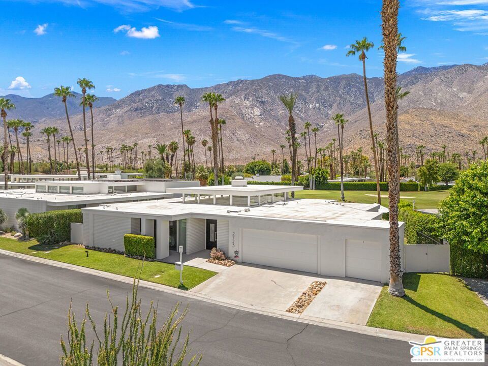 RARE TO MARKET and rich in architectural pedigree, this stunning home is part of William Krisel's celebrated Kings Point community in South Palm Springs. One of just 44 residences built between 1968 and 1970 in Krisel's signature "International Modern" style, this property sits perched above the fairway at Indian Canyons Golf Resort with commanding west-facing views of the mountains. It's a standout example of Krisel's design philosophy consisting of clean lines, open interiors, strong vertical and horizontal elements, and a seamless relationship between indoor and outdoor living. Architectural concrete block walls, clerestory windows, and expansive glass define the space, while extended roof eaves provide shelter from the desert sun and emphasize a relaxed yet elegant lifestyle.A grand living room with central fireplace anchors the home, flanked by multiple conversation areas, formal dining, and a dramatic wet bar that serves as both focal point and gathering place. Motorized shades on the western windows add comfort and privacy, while sliders open wide to a hedged patio with room for a pool and a stunning Krisel-designed fire pit that's both sculptural and functional.The kitchen is light and bright, with a large pantry area, double ovens, and a cozy breakfast nook. Bedroom separation is ideal, with a spacious ensuite primary featuring big views, an oversized cedar-lined walk-in closet, and a large bath with the original sunken tub plus a tiled shower. Two additional guest bedrooms share a full bath, including one with built-ins and its own private patio.Additional features include a powder bath off the formal entry, direct access to a two-car garage, laundry closet, storage room, and separate golf cart parking. Kings Point is one of Palm Springs' most architecturally significant communities and a perennial favorite on the Modernism Week tour. Residents enjoy a private setting with a central greenbelt, two association pools, four tennis courts, and a striking pool pavilion that reflects the best of midcentury resort design.Take the Matterport virtual tour to experience this exceptional home for yourself.