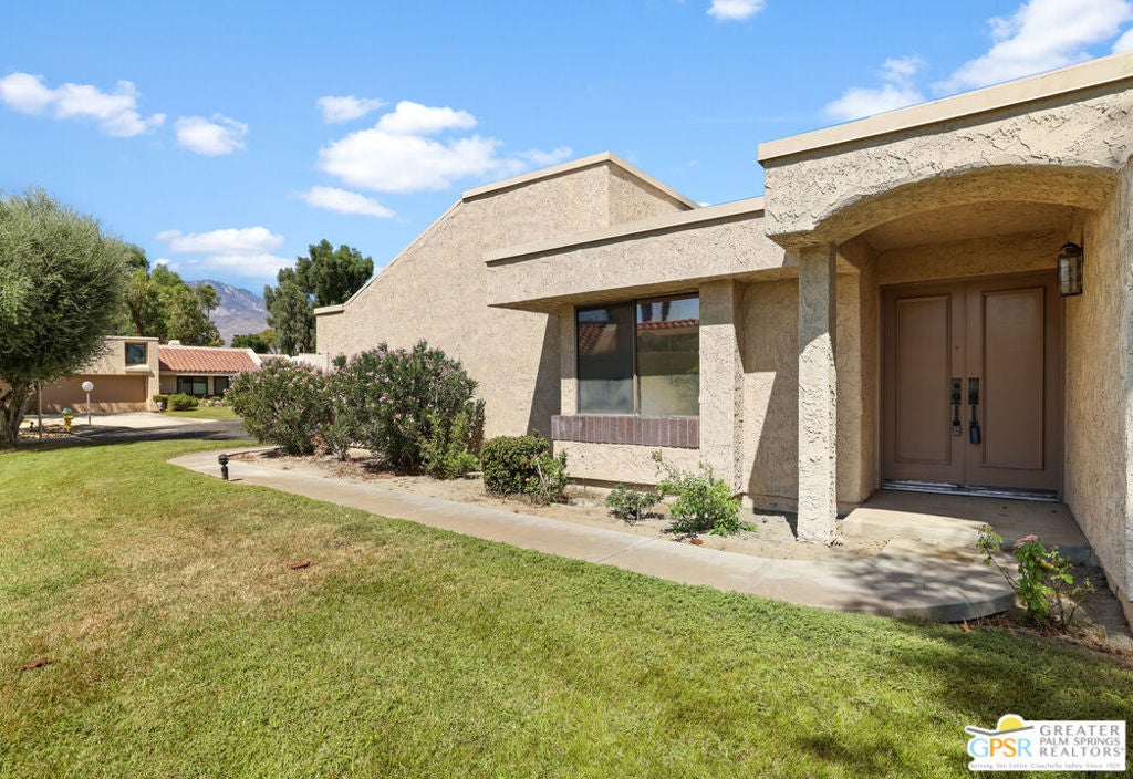 This three bedroom, 2 bath condo is located on a quiet green belt in the gated community of Cathedral Canyon Country Club. Price to sell and ready for your personal touch to make this home your own. Weather a seasonal visitor or a permanent resident Cathedral Canyon Country Club has everything to offer..... an 18 hole golf course, swimming pools, tennis courts and Jax's restaurant. Condo includes an attached 2 car garage, covered patios, a spacious primary bedroom and living room with vaulted ceilings, cozy fireplace and features an original bar with direct access to outside patio. Turnkey furnished.
