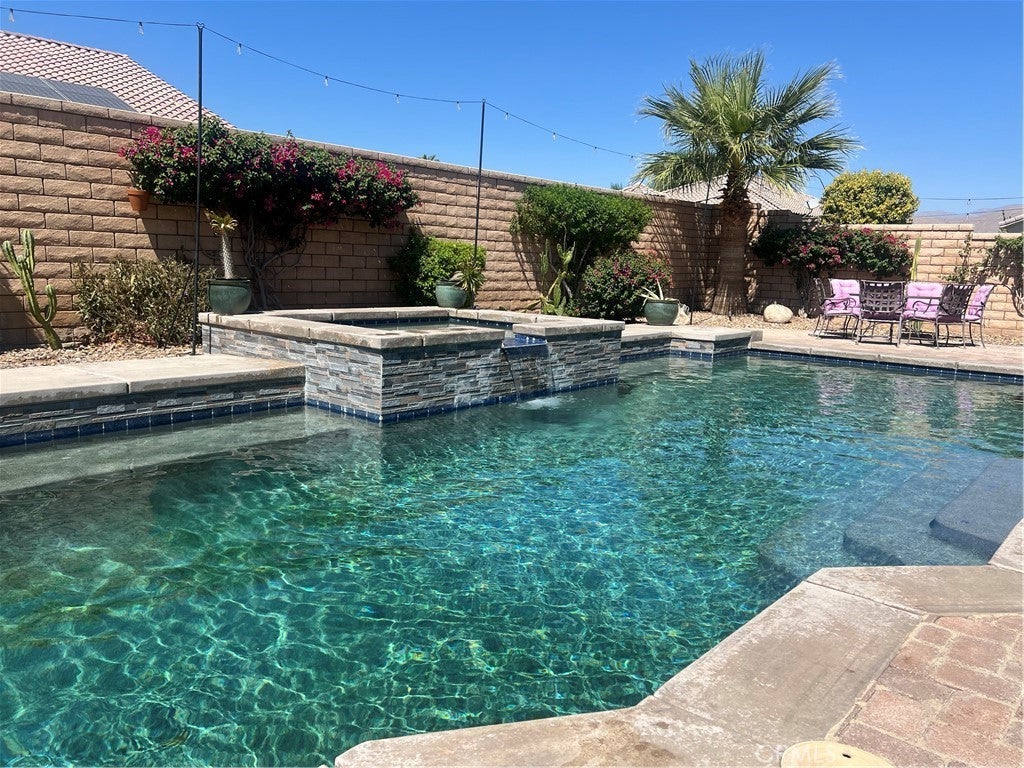 Welcome to your dream pool home in the exclusive Foxstone community of Indio! This beautiful 3-bedroom, 2-bath residence offers 2,080 sq ft of stylish living space and is completely move-in ready. Situated on a spacious corner lot of over 9,500 sq ft in a quiet cul-de-sac, this home is designed for the ultimate desert lifestyle. With meticulous attention to detail, the property features a lushly landscaped front yard and elegant pavers in the backyard. Step inside to find bright, airy formal living and dining rooms that invite natural light. The chef’s kitchen seamlessly connects to the open-concept great room, making it perfect for entertaining. Features included: tile flooring, carpet, ceiling fans, and a stunning built-in media center. The primary suite is thoughtfully located away from the guest bedrooms for added privacy and boasts a luxurious bath with dual sinks, a walk-in shower, a soaking tub, and a generous walk-in closet. Step outside to your own personal oasis: a breathtaking saltwater pool and spa, complete with a built-in BBQ, a covered patio with a ceiling fan, gorgeous pavers, and low-maintenance landscaping. Whether you want to relax by the cozy gas fire pit or soak up the sun, this backyard is a true paradise. Plus, enjoy the added benefits of RV parking and OWNED SOLAR—no leasing required, which translates to significant savings! With its stunning features and prime location, this home is must-see. Don’t miss out on this incredible opportunity!