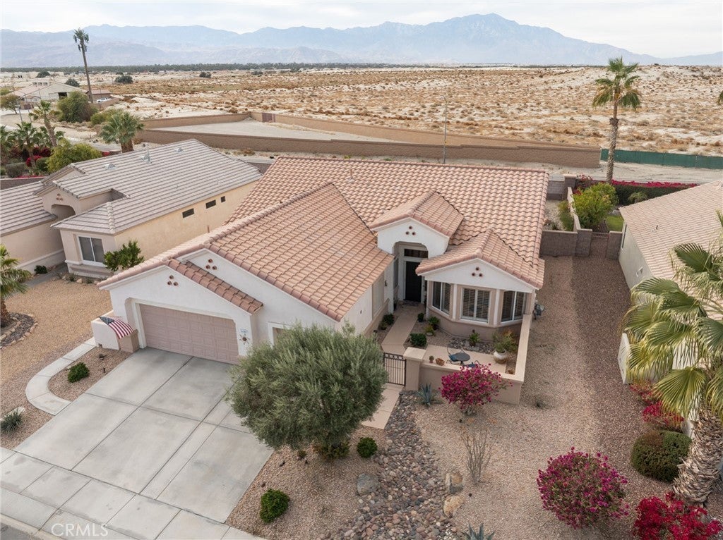 Welcome to 37701 Medjool Ave, a beautifully maintained 3-bedroom, 2-bath single-story home located in the highly desirable gated 55+ community of Sun City Palm Desert. This home showcases pride of ownership with tasteful upgrades and an inviting, open floor plan filled with natural light. The spacious great room combines the living room, kitchen, and dining area, creating the perfect space for entertaining or relaxing with family and friends. The large master suite features dual sinks, a walk-in shower, and a generous walk-in closet, offering a peaceful retreat. The two secondary bedrooms are well-sized and come equipped with ceiling fans, carpeting, and ample closet space. Additionally, there’s a bonus room that can be used as an office, gym or even additional bedroom. An indoor laundry room provides added convenience, leading directly into the expansive 3-car garage. Outside, the beautifully landscaped backyard is a serene oasis, complete with mature trees, lush grass, an Alumawood patio cover, and a private in-ground spa—perfect for enjoying the desert climate in comfort and style. Sun City Palm Desert offers an unparalleled lifestyle with a wide range of amenities, including golf, pickleball, pools and spas, a full calendar of activities, as well as internet and cable packages—all contributing to a vibrant, active community. This home offers a perfect blend of comfort, style, and convenience in one of the desert’s most sought-after communities.