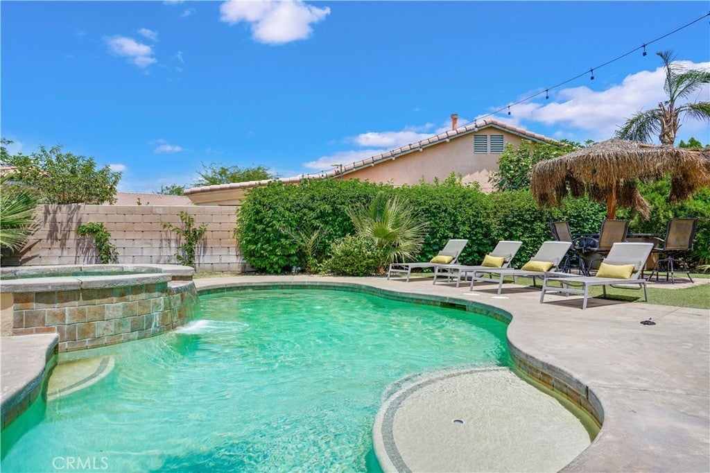 Active Airbnb property! No HOA fees. This home in Villa Montego offers a comprehensive package, nestled in a tranquil cul-de-sac with RV parking and close proximity to Coachella music festivals, golf courses, and entertainment. Plus, it features owned solar panels! The kitchen showcases exquisite granite countertops, a tile backsplash, upgraded stainless steel appliances, luxurious dark wood cabinets, a generously sized center island, and an expansive walk-in pantry. Adjacent to the kitchen is a spacious great room with diagonal sixteen-inch laminate flooring and a fresh coat of paint throughout the interior. Outside, there's a wonderful outdoor entertaining space with a pool, spa, covered patio, and palapa. The landscaping includes pink guava, pomegranate trees, and chili plants. The property has a solar.