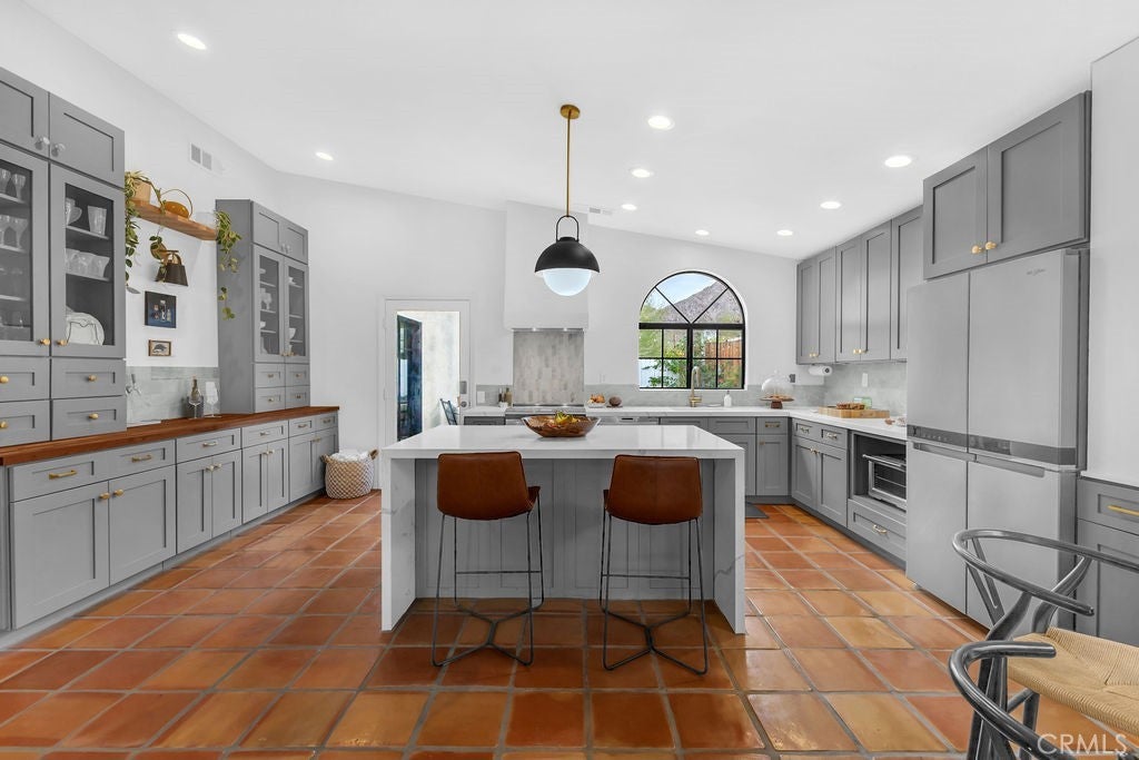 Discover the perfect balance of timeless Hacienda charm and contemporary design in this newly remodeled La Quinta Cove retreat. From the moment you step inside, the thoughtful blend of high-end finishes and smart home technology sets the tone for a beautiful and functional space. Sunlight pours into the home, highlighting the Saltillo tile floors and the warmth of the electric fireplace. The new kitchen features quartz countertops, a waterfall-edge island, marble backsplash, and an Italian plaster range hood, while a built-in banquette and wet bar, complete with an in-wall tap system, make it ideal for entertaining. The primary suite offers comfort and style with plank flooring, a second fireplace, and smart blackout curtains, leading to the luxurious bathroom with a quartzite tile pedestal soaking tub, rainfall shower, and premium finishes. Outside, the 6,000-gallon saltwater pool, equipped with a heater, chiller, splash pad, and smart controls, is framed by stunning views of the Santa Rosa Mountains. Designed for ease and enjoyment, this home integrates advanced technology, a solar energy system, and a seamless indoor-outdoor flow, offering the ultimate desert lifestyle in one of La Quinta’s most picturesque settings.