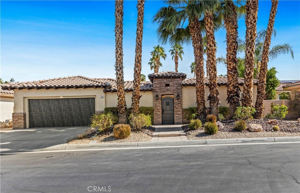 Located behind the gates of Palmira, this beautifully designed property offers the perfect blend of comfort, privacy, and indoor-outdoor living in the heart of Palm Desert. A gated front courtyard welcomes you in, offering a peaceful and private entrance to the home. Inside, natural light pours through large windows, highlighting the high ceilings and open floor plan. At the center of the home, the inviting living room features a cozy fireplace, wet bar, and expansive windows with views of the backyard. The kitchen is both functional and welcoming, complete with a breakfast bar and a picturesque view of the pool and lush landscaping. Just off the kitchen, the dining area is perfectly positioned for effortless gatherings, while a separate family room with another fireplace provides additional space to relax. The spacious primary suite is a true retreat, offering high ceilings, plenty of windows, and an en suite bathroom with dual sinks, a separate vanity, a walk-in shower with dual doors and showerheads, a soaking tub, and a large walk-in closet. Secondary bedrooms are thoughtfully placed for added privacy, and a detached guesthouse adds flexibility for visitors or additional living space. The backyard is beautifully landscaped with a pool and patio, creating the perfect setting for relaxing or entertaining under the desert sky. A two-car attached garage provides convenience and extra storage. Designed for effortless living, this home offers both comfort and style in an ideal location.