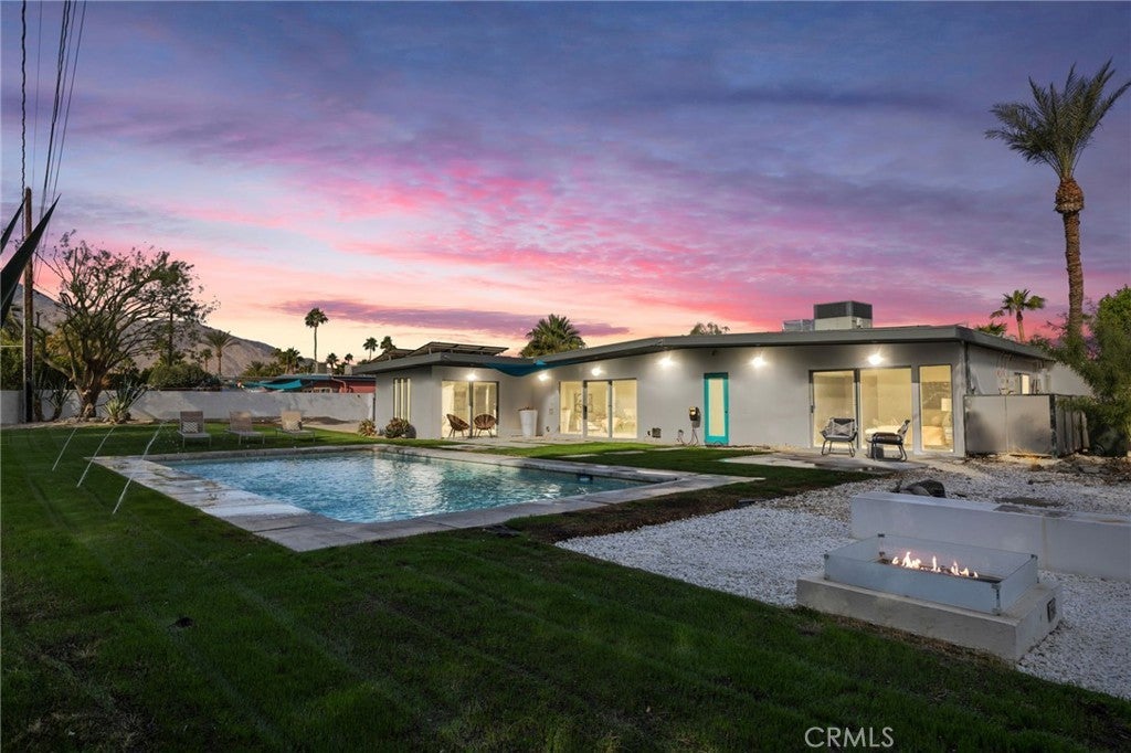 PAID SOLAR! Welcome to El Rancho Vista Estates, one of Palm Springs’ most celebrated mid-century enclaves. This architectural compound, designed by the renowned Donald Wexler, was built in 1960 and offers a rare 3-4 bedroom option, 3-bathrooms, offering 2,195 square feet of living space on one of the largest lots in the neighborhood. Recently renovated, the home seamlessly blends modern upgrades with the timeless beauty of mid-century design. You'll love the open floor plan that features expansive glass windows that invite natural light and stunning views of the pool and lush yard from almost every room, decorative mosaic tiles in the bathrooms, and clerestory windows—classic elements of mid-century modern architecture. The spacious, modern kitchen is a true focal point with Electrolux stainless-steel appliances. Set on a 16,117 fully landscaped lot, the oversized backyard is a true desert retreat. Enjoy a sparkling pool with a tranquil water feature, a fire pit with seating, and plenty of room for outdoor activities like volleyball, croquet, or creating your own play field. The possibilities are endless here for outdoor living and entertaining. As if that wasn't enough, the home comes equipped with a new electrical panel, newer HVAC system and 55 fully paid-for solar panels, ensuring energy efficiency and lower utility costs throughout the year. This property is ONE-OF-A-KIND with easy access to downtown, golf and dining at Escena Golf Club and so much more.
