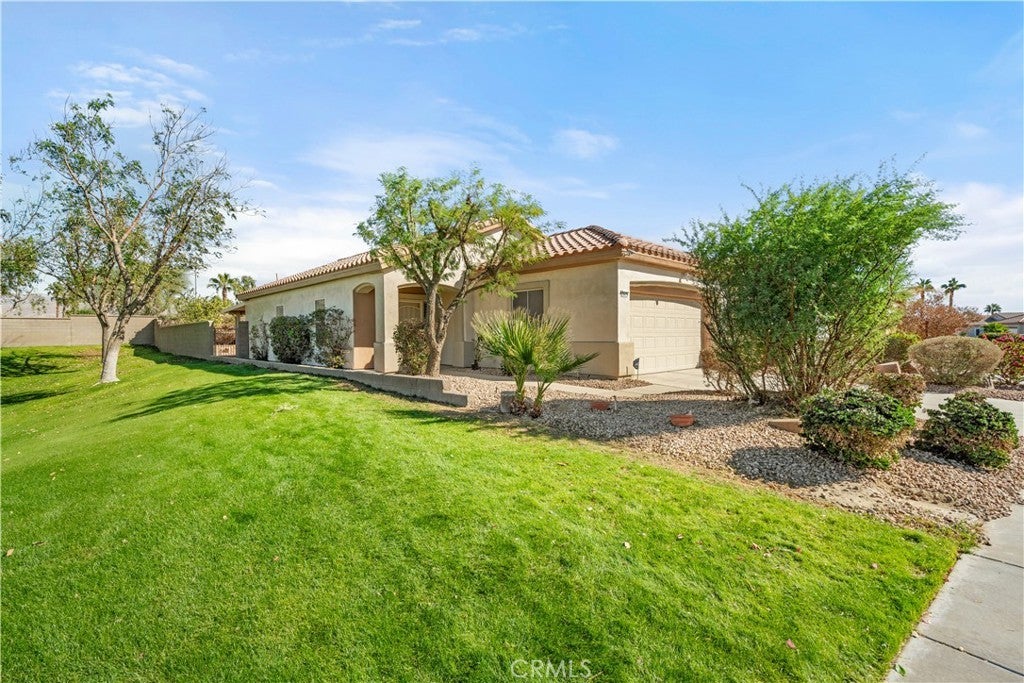 Enjoy the best of carefree living in the 55+ community, Sun City Palm Desert. This Pasadena model home is one of the most desirable and located right on a greenbelt. Just needs some TLC. The open floor plan features a spacious primary with walk in closet. Stall shower with glass doors. The second bedroom on the other side of the home makes a perfect guest room or den. Tile flooring throughout. The kitchen is open to the living area and has a slider out to the sprawling backyard with covered patio. Sun City Palm Desert is a nationally renowned gate guarded active adult community with golf courses, pools, tennis, pickle ball, fitness centers, dog parks, movie theater, restaurants, and many social/activity clubs. This home is ready for new owners to make it their own!