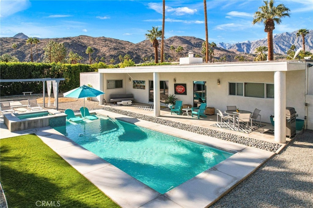 Another price reduction! Located in the sought after Tahquitz Creek Golf neighborhood with buried utility lines, 7Palms is a well appointed, open concept two bedroom, two bath home that would make an ideal pied a terre, full time residence or vacation rental. Designed for indoor/outdoor living, the living area seamlessly flows into the backyard covered deck, pool and bocce ball court areas. Outside, enjoy several private seating areas that provide total sun protection or access to full sun with full mountain views. Enter the house through the private front patio where you can sit and enjoy morning coffee with unobstructed views of San Jacinto. In the rear yard, all seating is around the recently constructed pool and spa. Sunbathe in the gazebo, or use it to have outdoor meals under the stars. A regulation sized bocce ball court is steps away. Use the court, or convert it to RV parking or a pickle ball court. The oversized, corner backyard area is completely private with dense ficus trees all around the yard. Inside 7Palms, high ceilings in the great room and kitchen areas bely the homes smaller size. Large sliders and windows help bring the outside in. Beautiful concrete floors are maintenance free. Kitchen has high end appliances and is thoughtfully laid out. Attached garage leads into the kitchen. Washer/Dryer and additional storage space located in the garage. Separate dining area seats 6 easily. Artfully tiled fireplace separates the dining area from the living area. Both bathrooms have been recently remodeled with high end finishes. Master bedroom looks onto the pool and guest bedroom has a clear view of San Jacinto. Owners have lovingly remodeled this gem. Some furniture is included. This home is easily expanded or a casita can fit in the backyard if the new owner requires more indoor space. Please note, fireplace is decorative only. Improvements to home since 1/1/24 include fresh outdoor paint, new hot water heater, new elastomeric paint on roof, new wall and gate in front yard, new pebble plaster in pool and spa, new cool coating on pool coping and new artificial grass in backyard (May 10, 2024). House needs nothing and is in great condition.