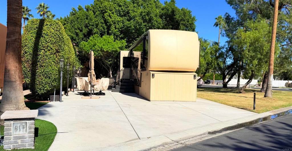 Lot 617, RV & Lot Package: Spacious corner lot located adjacent to large open space within walking distance to starter shack, satellite pool and spa, and clubhouse! Mature privacy hedges allowing for maximum shade. Newly expanded 6" think concrete pad with all new electrical, irrigation and synthetic lawn for low maintenance. Price includes all patio furniture and 2017 Mobile Suites (DRV38RSB3). Recent RV upgrades include: new recliners and side table, new kitchen faucet, new Maxx fan, new roof paint and new rooftop AC covers. Stairs, doghouse, bra and skirting all on the newer-side as well (2019-2023). Outdoor Resort Palm Springs (ORPS) is a Guard Gated 5-Star RV Resort Community offering an active and luxurious lifestyle featuring golf (27 holes), tennis, pickleball, swimming and more! Two clubhouses, fitness center, beauty solan, La Roma Restaurant on campus, dog park and more!
