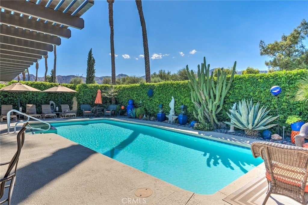 This stunning and spacious BROADMOOR MODEL offers 3,188 sq. ft. of free-flowing space designed for seamless entertaining and luxurious living. Flooded with natural light, this highly desirable home boasts an expansive great room, perfect for gatherings, with floor-to-ceiling glass sliding doors that bring the outdoors in. The accommodation kitchen features ample counter space, modern appliances, and an adjacent morning room to enjoy casual dining with breathtaking views. The dual primary suites each provide a private retreat, complete with their own patio access, updated en-suite bathrooms, and a fireplace for warmth and ambiance. The home also includes a formal bar area, a spacious laundry room, and wide hallways that enhance the sense of openness. The two-car garage contains additional space for a golf cart. Step outside to the expansive patio area, where a full-size pool invites relaxation, all set against the backdrop of sweeping mountain views. Every bedroom has direct access to a private patio, ensuring a seamless connection to the serene outdoor spaces. 44 owned solar panels enhance energy efficiency, while an outdoor misting system and excellent sound speaker system elevate comfort and entertainment. This exclusive, gated golf community is located within The Springs Country Club. It offers world-class amenities, including a state-of-the-art fitness center, 46 community pools, tennis courts, pickleball, and an elegant clubhouse. Ideally situated across from Eisenhower Medical Center, with easy access to fine dining and premier shopping, this home presents a rare opportunity to enjoy resort-style living in the heart of the desert.