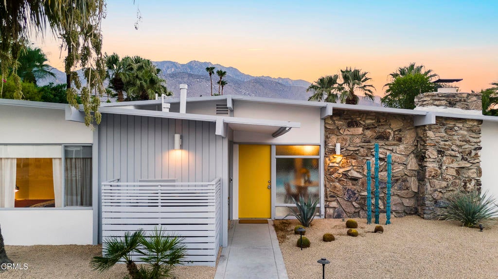 Quintessential 1958 midcentury designed by Palmer + Krisel architects and built by the Alexander Construction Company. Stunning views of the San Jacinto Mountains located on a large lot in historic Sunrise Park in central Palm Springs on Orchid Tree Lane, one of the most coveted streets in the neighborhood. This 3 bedroom / 2 bath pool-home is currently a popular revenue-generating vacation rental with abundant rave reviews and is being offered turnkey. The list price includes the carefully curated distinctive handpicked modern and period collection of furnishings and decor with some exclusions. The spectacularly outfitted indoor-outdoor bright designer home on fee land features an open floor plan, a private and recently updated expansive yard with lush landscaping, automatic irrigation, outdoor lighting, multiple seating areas with mountain views, a gas fire pit, a brand-new saltwater pool + spa, fruit trees, and a propane gas bbq grill. The architectural property features several original signature Alexander details, including the sloped roof, tongue-and-groove ceilings, clerestory windows, skylights, a gas stone fireplace, floor-to-ceiling walls of glass, and sliding doors that open to the large and private yard. The master suite and expanded and permitted great room open to the backyard, pool and spa. The property also features updated baths, an updated kitchen with stainless steel appliances and wine fridge, finished concrete floors, central air and heat, dual pane windows, EV Tesla charger, Nest Smart Thermostat, smart TV's, LG washer + dryer, generous indoor and outdoor storage areas, and even an electric air pump for pool floats. The large lot provides ample room for parking, lounging, entertaining, and enjoying the Palm Springs lifestyle. Peaceful location, yet blocks away from markets, the cinema, and Palm Springs restaurants and shops.Please contact agent for showings. Listing is on Supra. Text or call Bonnie Matthews 323-697-0687