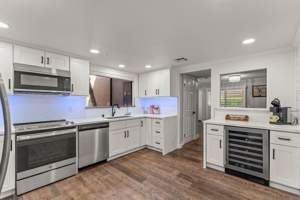 Welcome to the Beautiful community at "THE POINTE" with gorgeous views of the Santa Rosa & San Jacinto Mountains. This newly renovated 2 bedroom, 2 bathroom condo is located in South Palm Springs with NO LAND LEASE and is just minutes from Los Compadres Club. Step inside to discover an open-concept living space bathed in natural light, featuring stylish finishes. The spacious living room area is perfect for entertaining guests, enjoying the views, or enjoying a night in, by the cozy fireplace. The unit features: new flooring, recessed lighting, crown molding, new interior paint throughout the unit, dining area, new sliding doors in the living room and bedroom, and shutters throughout the home. The remodeled kitchen boasts quartz countertops, stainless steel appliances, recessed lighting, new cabinets, cabinet underlighting, a wine cooler, and a breakfast bar, making it a chef's delight. The spacious primary offers a walk-in closet and en-suite bathroom. The second bedroom is equally inviting, perfect for guests or a home office, with easy access to the beautifully renovated second bathroom. Enjoy stunning mountain views from the privacy of your living room, or sit in one of the patios to enjoy a morning coffee or evening relaxation. Located in a serene and well-maintained community, this property offers the perfect combination of luxury, comfort, and convenience. The condo also includes in-unit laundry/utility room, a private patio with direct access to the 2 car garage and unit. Situated in a desirable community with amenities such as a sparkling pool, spa, pickle ball, and tennis courts, you'll experience resort-style living every day. Located just minutes from downtown Palm Springs, you'll have quick access to world-class dining, shopping, and entertainment. Ideal for a primary residence, a vacation home., or an excellent investment opportunity. Don't miss out on the chance to own this exceptional condo in the heart of Palm Springs. Come and experience the best of desert living!