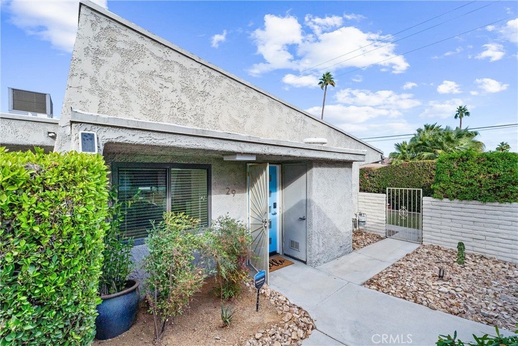 What a wonderful opportunity! A gorgeous, updated Single Story condo in Gated Ramona Villas Community. Ideally located in the heart of Palm Springs on FEE SIMPLE LAND and so close to the center of all the fun that Downtown Palm Springs has to offer. The dining, the shopping and so many local establishments nearby to enjoy or just enjoy the serenity of your fabulous desert home. Tucked away down a beautifully landscaped and manicured walkway, its location provides privacy and a peaceful setting. Once you open the fantastic blue door and enter the home be prepared to be WOWED by the inviting, open and spacious main living area highlighted with large cool tile flooring, recessed lighting and a huge slider to your private backyard retreat. The kitchen has been upgraded with granite counters, cherry hued cabinetry and stainless appliances. It has been reimagined and now opens to the living and dining areas adding to that modern atmosphere. Down the tiled hall you have a generously proportioned guest bedroom with a mirrored slider. Across the hall is the full guest bath with an updated vanity. At the end of the hall is the huge primary suite with a wall of mirrored closets, a slider to the backyard patio area and a bonus of a second area in the primary bedroom set up as a desk area. The private bath was upgraded and features a no step custom tiled large shower. For your convenience, there is also an interior laundry closet. Additional upgrades are a tankless water heater, water softener and a newer central HVAC unit. The refrigerator, washer and dryer are included. It still gets better! The Ramona Villas Gated community has so much to offer. A large saltwater pool, a spa, a clubhouse, a fitness room, a tennis court, a community herb garden area and charging stations for electric vehicles. A fantastic home, an amazing community in an ideal location and an incredible opportunity to come enjoy the Wonderful Palm Springs lifestyle!