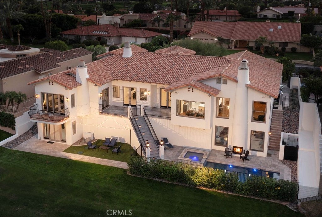 Bermuda Dunes CC - Enjoy the daily magic as sunlight filters through floor-to-ceiling French doors into a Great Room where the boundaries between indoor and outdoor living dissolve completely at this remarkable Bermuda Dunes Country Club estate, a 4,708 sq. ft. testament to sophistication that commands its elevated position above the 8th fairway. Recently transformed through an exhaustive two year collaboration with Desert Modern Design + Build, the home marries the romance of Modern Spanish design with the ease of contemporary desert living. The result is a residence that feels both rooted in tradition and entirely of the moment, where hand troweled mission finish walls meet sleek Wolf and Sub-Zero appliances. The journey begins in a cobblestone courtyard, where mature desert landscaping creates an intimate prelude to the home’s pièce de résistance: an 18-foot beamed rotunda entry that announces the architectural ambitions within. Here, soaring 11 foot ceilings become the standard rather than the exception, carrying through the Great Room, the chef’s kitchen, and the nearly 1,000 sq. ft. primary suite. At the heart of the home, the kitchen doesn’t merely function, it performs. A dramatic 70 square foot island anchors the space around the farmhouse sink, wine storage and professional-grade appliances. Above, coffered ceilings create architectural rhythm, while a handcrafted wrought-iron beehive fireplace adds an artisanal counterpoint to the modern functionality. The primary suite occupies its own wing of tranquility. Morning arrives gently here, illuminating the hardwood floors, with a private balcony accompanied by fairway views. Dual walk-in closets, a fireplace, and a spa-like bathroom with freestanding soaking tub create a private resort within the residence. This home’s true genius reveals itself in its multi-generational flexibility. A lower level bonus space adapts effortlessly from home office to fitness studio to creative workshop. The attached casita, nearly 500 sq. ft., with a private entrance offers sophisticated autonomy for guests or extended family. Outside, the blue Talavera tiled pool and spa anchor an entertainment complex with outdoor fireplace and lawn theater area. Four bedrooms, four baths, four fireplaces and an oversized three-car garage complete this exceptional offering. This is an incomparable opportunity that will continue to provide an extraordinary setting for all who have the pleasure of spending time here.