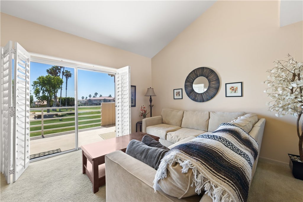 Take a look at this fantastic upper level condo located in the Palm Royale Country Club with fairway and mountain views along with views of water features. Living room has vaulted ceilings. Plantation shutters on all windows and sliding glass doors. A close walk to the community pool and spa. Low HOA dues at $450 a month covering 6 resort style pools and spas, clubhouse with pro shop, building maintenance, pickleball courts, gym, tennis courts, tv w/cable and more. Two dog parks for your furry friends. Across the street from Indian Wells Tennis Gardens, shopping center, restaurants and close to freeway access.
