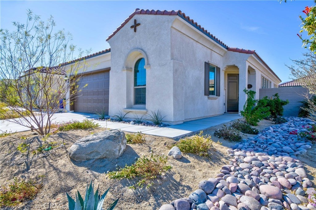 Make plans to see this newest phase 6 home with Super Motivated Sellers near the rear and side exit gates, with owned solar and many tasteful upgrades and accents in the upscale 55+ Del Webb Rancho Mirage community. Upon entry you will notice the upgraded 12 x 24 floor tile everywhere but the carpeted bedrooms. The kitchen shines with Bianco Levanto quartz counters with full height quartz backsplash, stainless Whirlpool appliances still under warranty including a microwave/oven combo with Air Fry, stainless canopy range hood, a bar counter with bold blue paint and a custom tile wall, walk-in pantry and slide out recycler/trash bin. The living room has slider doors that open in both directions to bring the outside in, dramatic color accent on tv wall, classic tall drapes and tasteful window coverings. In the spacious primary suite, you have plantation shutters, a painted accent wall, a closed-in bathroom with bi fold doors, truffle white countertop, a walk-in closet, linen closet and blue accent wall tile in the walk-in shower. The garage features a tankless gas water heater and a 220v outlet for car charging or powering shop tools. The fully landscaped backyard encourages natural beauty and serenity with a full width patio cover with lighting, multiple paved seating areas, a grassy area, drainage and many plants and trees. There are many upscale features at Del Webb including: a golf simulator and putting green, a wine room, card and billiard rooms, banquet and meeting rooms, a large gym, expansive hiking and biking trails, bocce ball, tennis and pickleball and a spa and multiple pools. You are also minutes from the Westin Golf and Country Club along with high end shopping at The River and El Paseos. When the grandkids visit, you are close to Splashtopia Water Park at the Omni Resort. This lovely space can be your next forever home.
