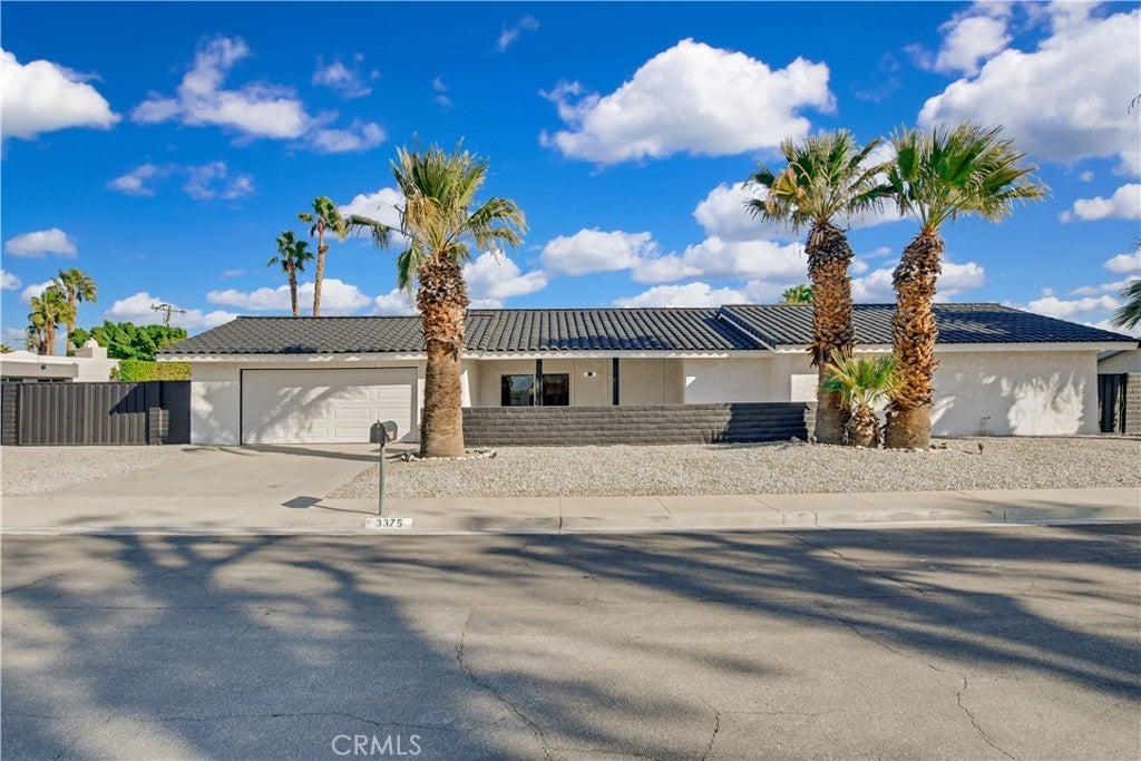 Welcome to your desert oasis in the El Rancho Vista Estates in Plam Springs! This single story residence offers 3 bedrooms, 2 bathrooms, and a generous 1433 sq ft of living space, nestled on an expansive 12632 sq ft lot on a private cul-de-sac with a back patio leading to the in ground pool and spa, you will enjoy a private oasis right in your backyard. With its inviting curb appeal, featuring low maintenance rock landscaping, palm trees, a front patio with a sitting area featuring two front entry points, a front door and a sliding glass door and a convenient attached 2 car garage, this property is sure to make a lasting impression. Inside, discover a welcoming open floor plan where the living room welcomes you with tile flooring, high ceilings, recessed lighting, a cozy fireplace, built in desk and abundant natural light streaming through the sliding glass doors. The kitchen features a spacious bar seating area, stainless steel dishwasher, microwave, 4 burner stove with middle warmer and oven, ample cabinetry, a stylish backsplash, and generous counter space, while the sliding glass door provides access to the backyard and showcases picturesque views of the pool. The hallway leads to the bedrooms and bathrooms The hallway bathroom features a walk in shower, tile flooring, single vanity sink with ample countertops. The two additional bedrooms provide ample space, each with unique features. Both rooms showcase decorative wallpaper, recessed lighting, built-in desks, closets and tile flooring. One features a window, while the other boasts a sliding glass door that opens to the side yard. The master suite featuring tile flooring, recess lighting, decorative wallpaper and a sliding glass door showcases picturesque views of the pool. The ensuite master bath offers a walk-in shower, soaking tub, a dual sinks, and ample counter space, a closet and an additional cabinet with counter space for added convenience. Outside, escape to your private backyard oasis. This outdoor retreat features a sparkling pool and spa, perfect for relaxing soaks. Surrounding the water, a unique low-maintenance landscape enhances the ambiance, with artificial turf, and eye-catching artistic elements. Unwind in the lounge gazebo, offering a shaded relaxing area. While the versatile side yards provide a blank canvas, ready for your personal touch. This property is conveniently located near major highways, shopping, dining, and entertainment, making it the perfect retreat for desert living.